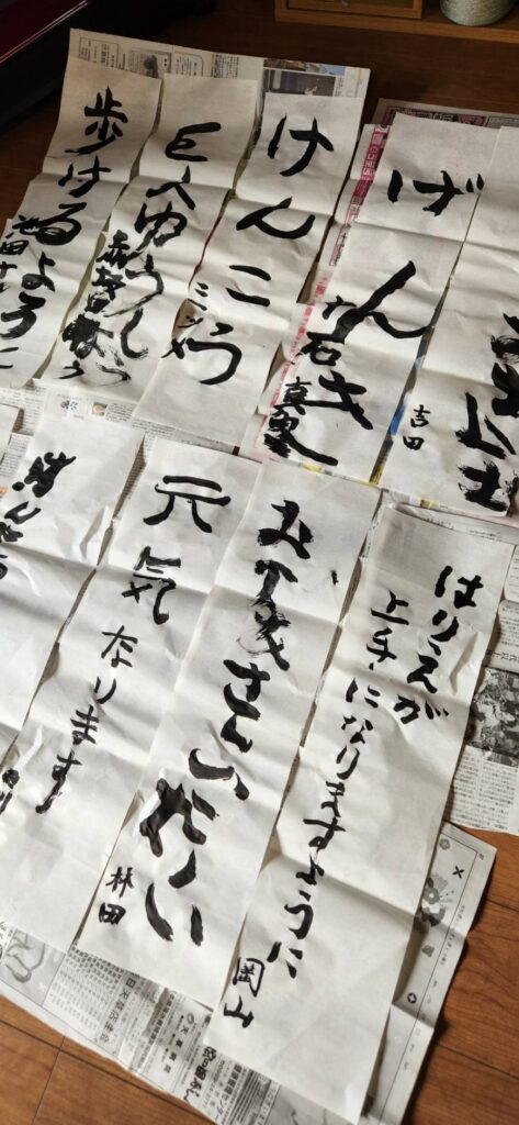 2026.01.21 書初め 氷川学園 \ 利用者様の作品紹介 / 今日はもみじユニットのみなさんが書初めに挑戦されていました。 筆を持つと、表情がキリッ。一文字一文字、集中して書き上げました! 力強い線、のびのびとした文字、どの作品にも「その人らしさ」があふれています。 書く楽しさ、できあがった時の達成感。そんな気持ちが伝わってくる、素敵な作品がそろいました✨